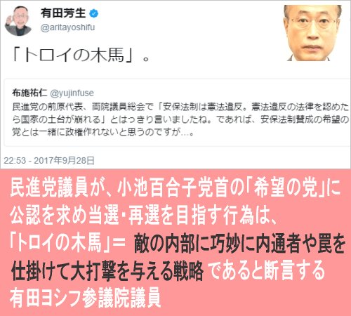 民進党議員は「希望の党」に送り込まれた「トロイの木馬」又は「埋伏の毒」
